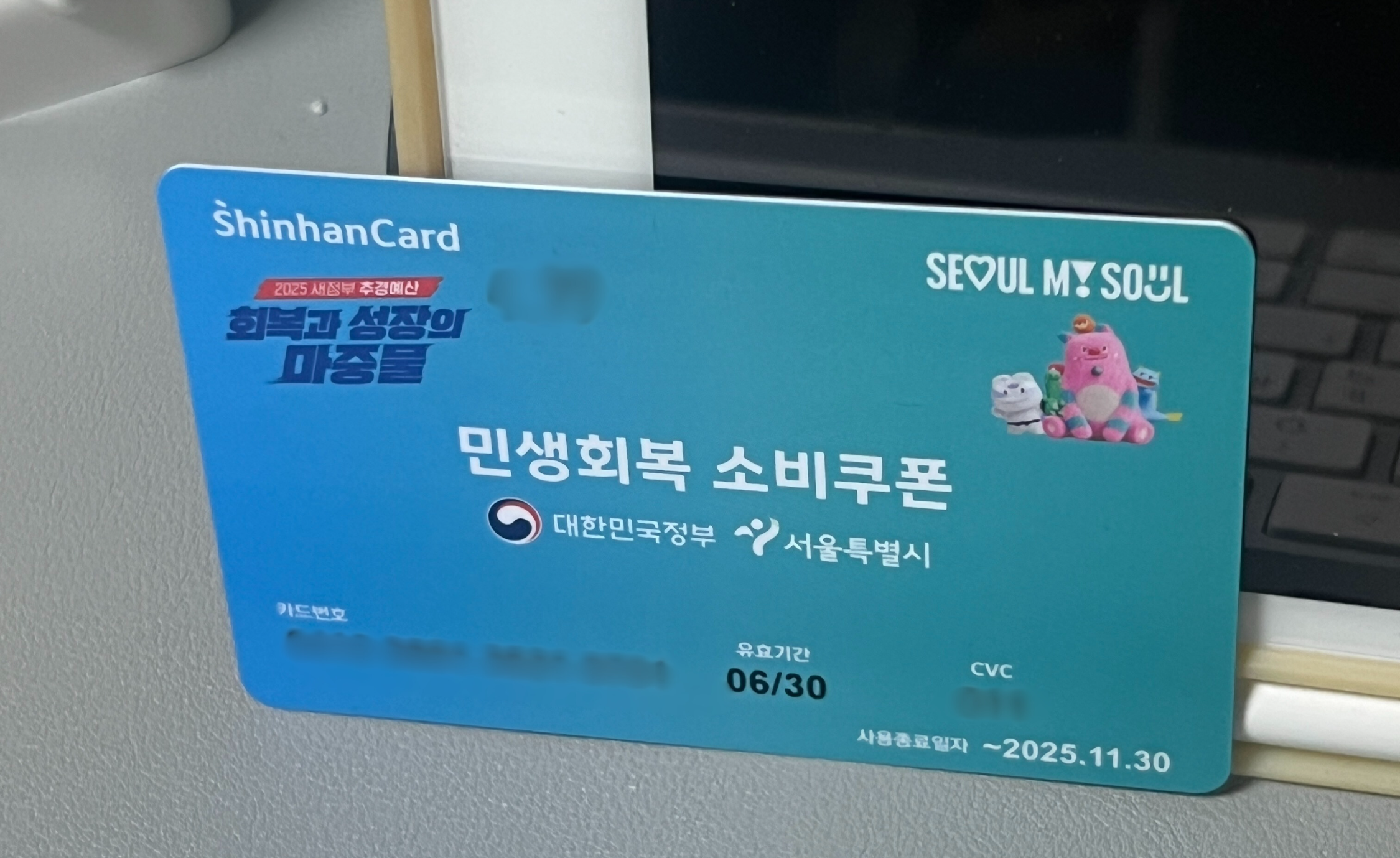 - 실물 민생회복 소비쿠폰 카드: 카드번호, 유효기간, CVC 번호 확인을 위해 필요합니다.