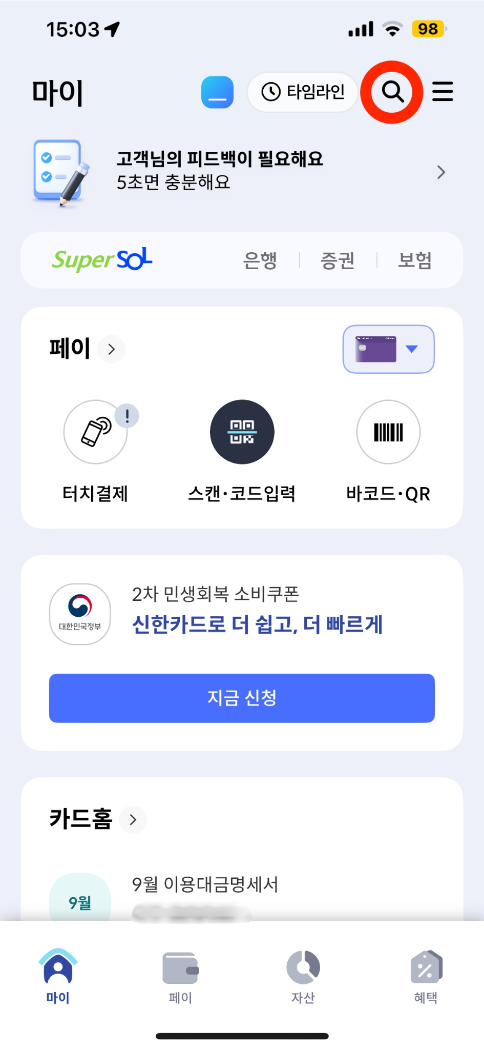 먼저 스마트폰에서 '신한 SOL페이' 앱을 실행합니다. 앱 실행 후 첫 화면(마이페이지)의 오른쪽 상단에 위치한 돋보기 모양의 검색 아이콘을 누릅니다.
