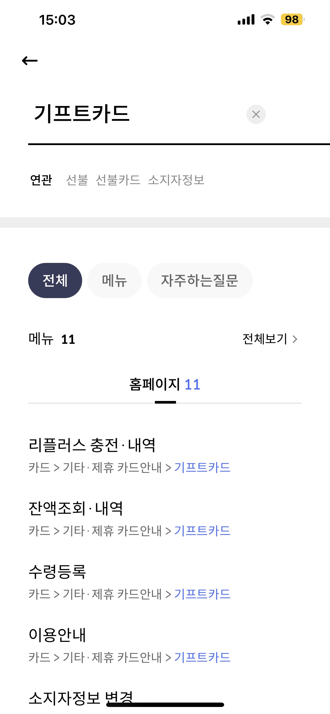 검색창이 나타나면 '기프트카드'라고 입력합니다.
